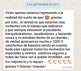 Sabemos que estarán ansiosos por ver sus fotos y video así que no te haremos esperar meses para tenerlos. Tus fotos en digital podrás tenerlas a más tardar una semana después de tu evento o sesión, dos semanas para tu highlight y 4 semanas en el caso de tu shortfilm! Nuevamente una de las ventajas de contratar a un equipo completo en vez de una sola persona.